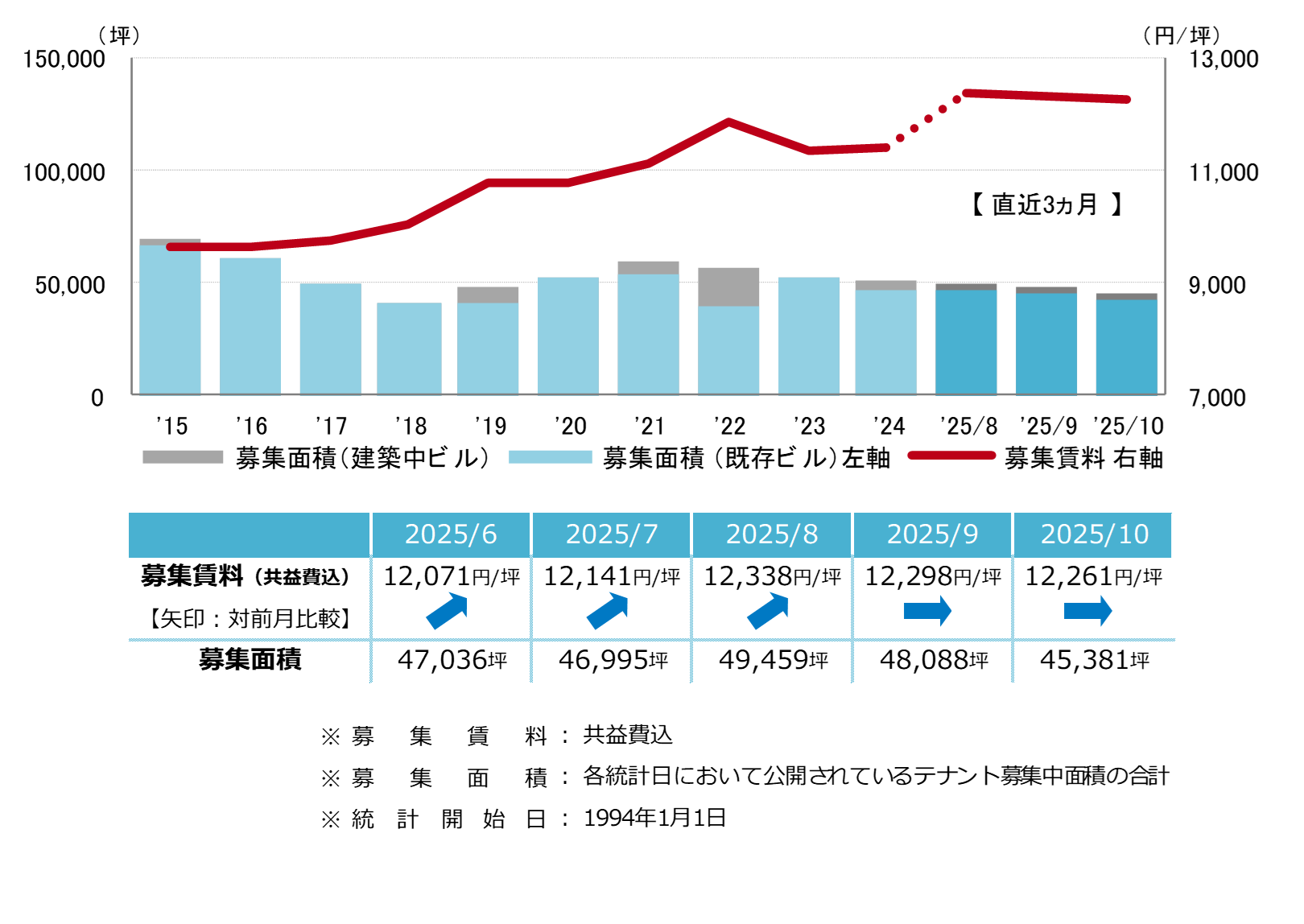 募集賃料は前月比マイナス37円/坪の12,261円/坪となった。2ヵ月連続の下落となったものの前月からほぼ横ばいで、賃料は12,000円/坪台前半で推移している。
