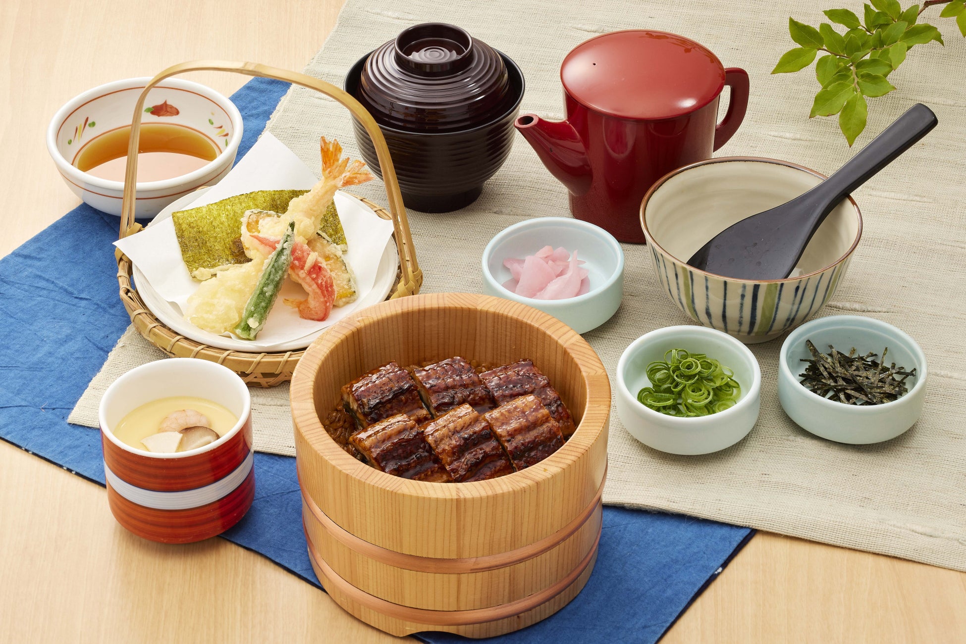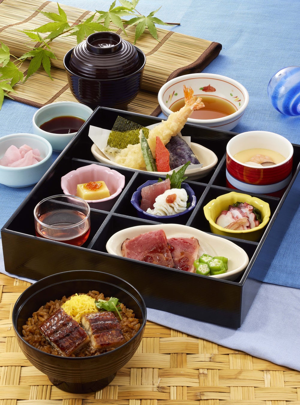 「炭火焼鰻」を使用した鰻ご飯に「国産活〆鱧」の湯引き、季節の天ぷら、真だこの酢の物、とうきび豆腐、ローストビーフ小鉢など夏の味覚を色々楽しめるぜいたくな和膳です。