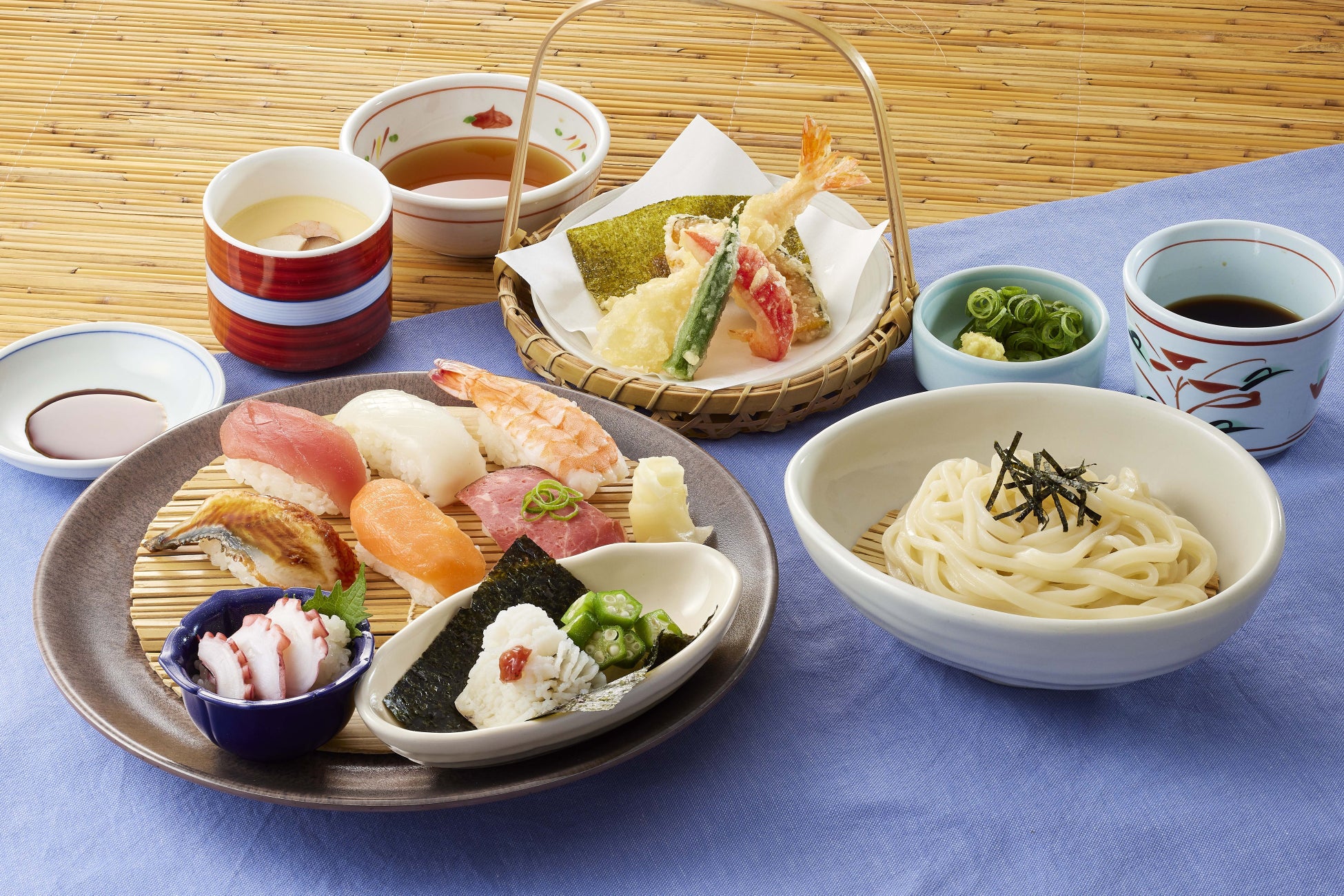 「国産活〆鱧」の湯引き、真だこといった季節のネタと、うなぎや鮪など人気のネタがのった寿司盛合せに、天ぷら、茶碗蒸し、そば/うどんがセットになった和膳です。