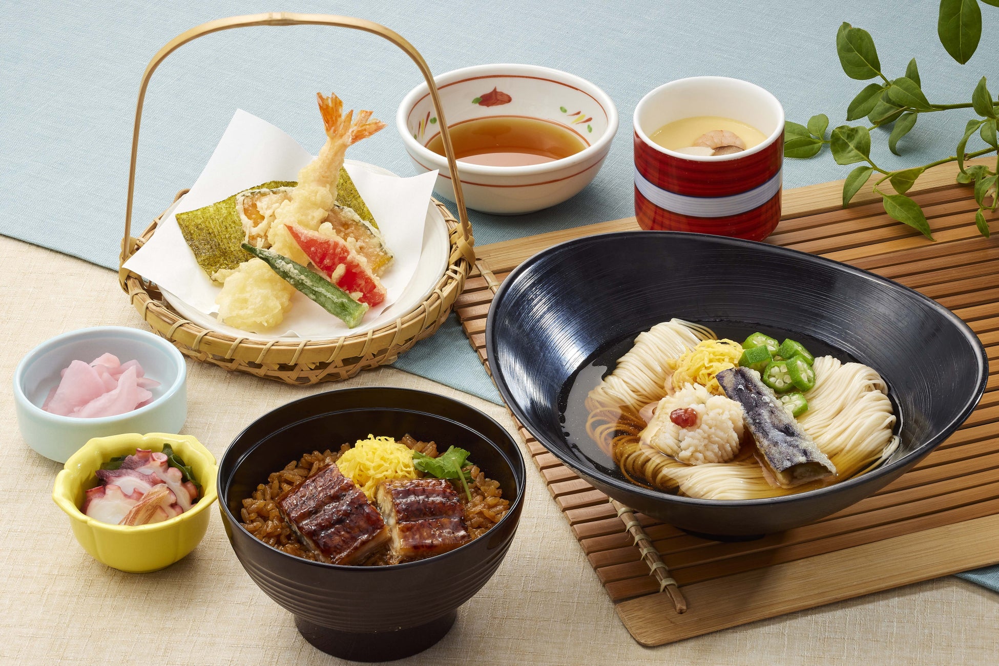 鰻ご飯と、手延そうめん「揖保乃糸」を使用した「鱧そうめん」に、とうきび豆腐、夏野菜を使った天ぷら盛り合わせも付いた、まさに夏を感じるおすすめの和膳です。