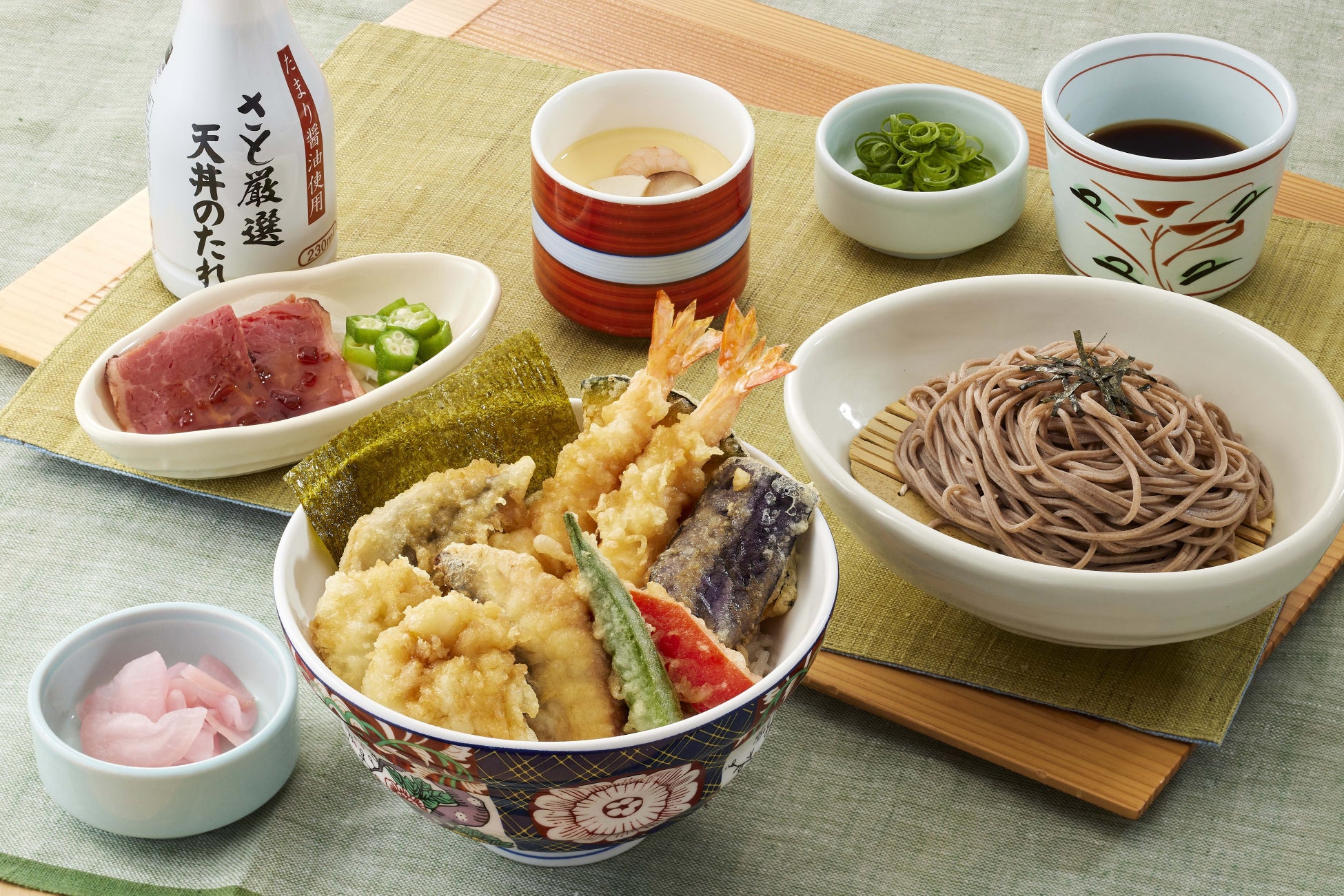 「国産活〆鱧」の天ぷらやパプリカ、なすなどの夏野菜に海老天が2尾付いた豪華な天丼と、ローストビーフ小鉢と茶碗蒸し、そしてそば/うどんがセットになった天丼御膳です。