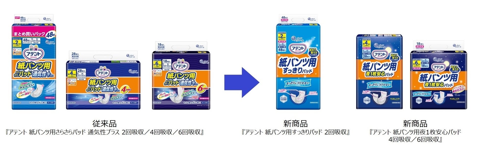 ・初めての方でも手に取りやすい『アテント 紙パンツ用すっきりパッド 2回吸収』と、睡眠の悩み・介護負担軽減をめざした『アテント 紙パンツ用夜1枚安心パッド 4回吸収/6回吸収』が登場。