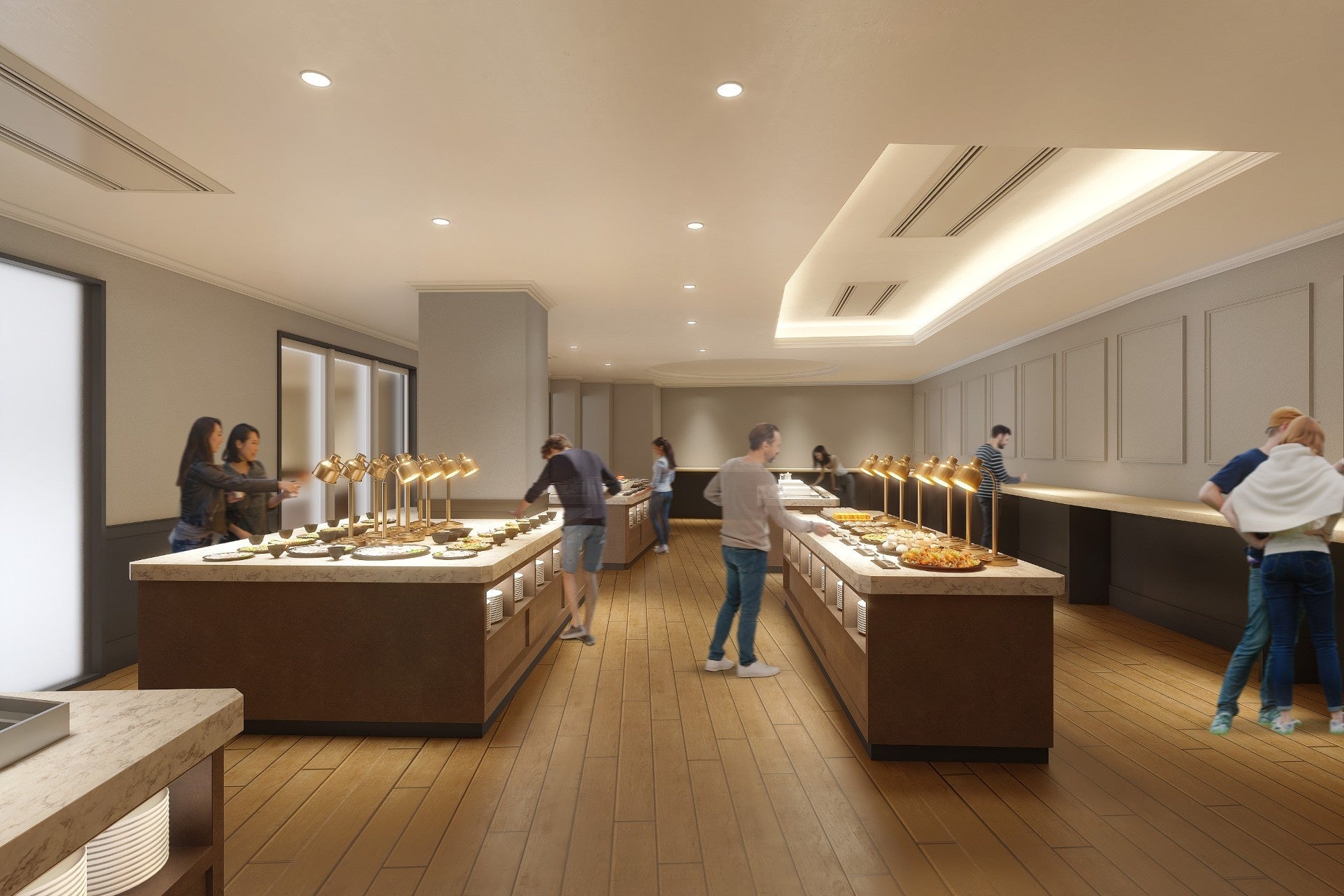 今回のリニューアルでは、客席エリアと、お料理がスムーズに取りやすい回遊式デザインのビュッフェエリアに分け、お食事をゆったりと楽しめる空間にいたします。客席エリアにはシェフのライブコーナーとデザートコーナーを新設し、昔懐かしい揚げパンを出来立てでご提供いたします。また、クイックにお食事をされたいお客様向けにカウンター席を設け、さまざまなお客様のニーズに応えるレストランに生まれ変わります。皆様のご利用をお待ちしております。