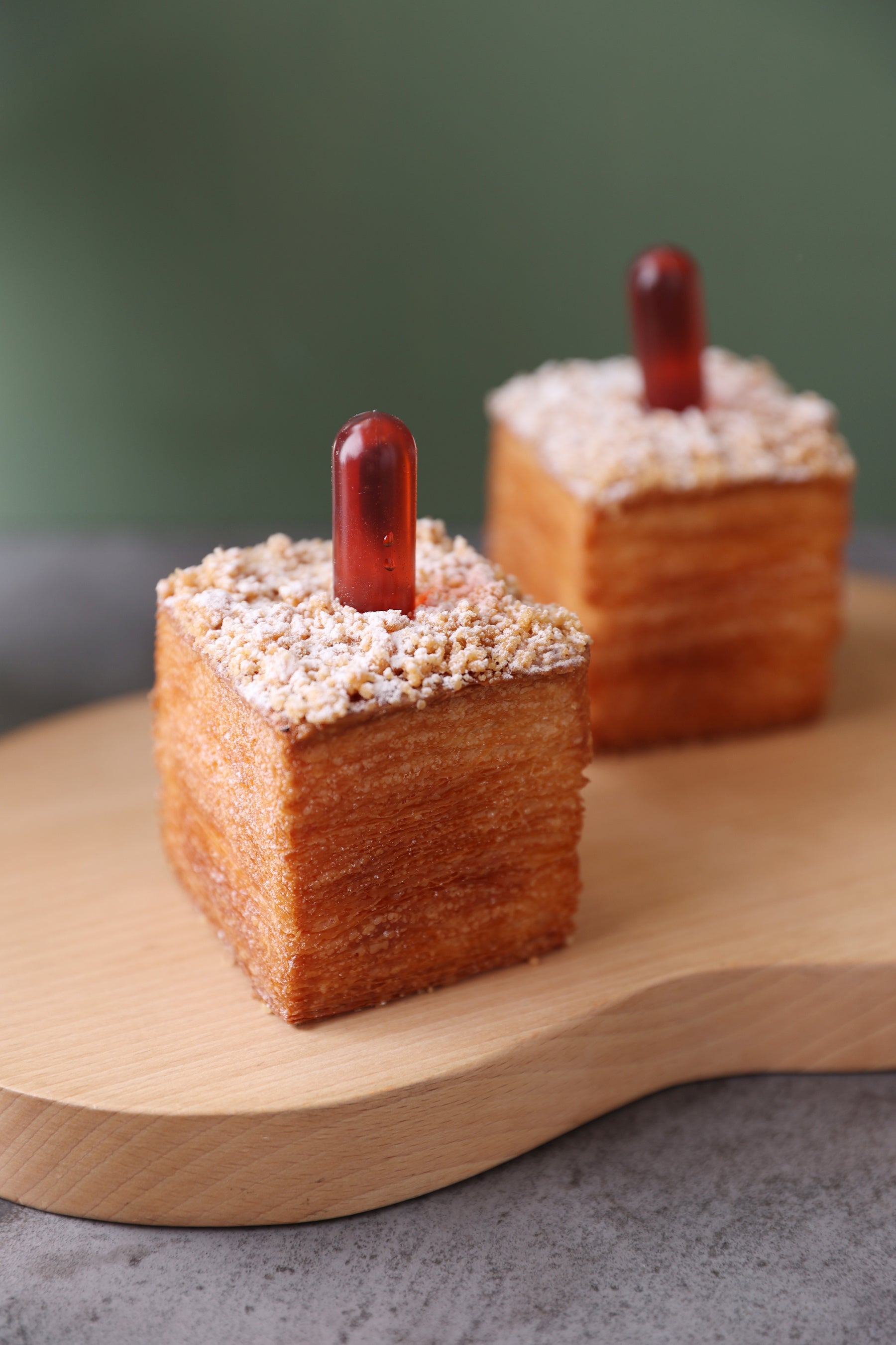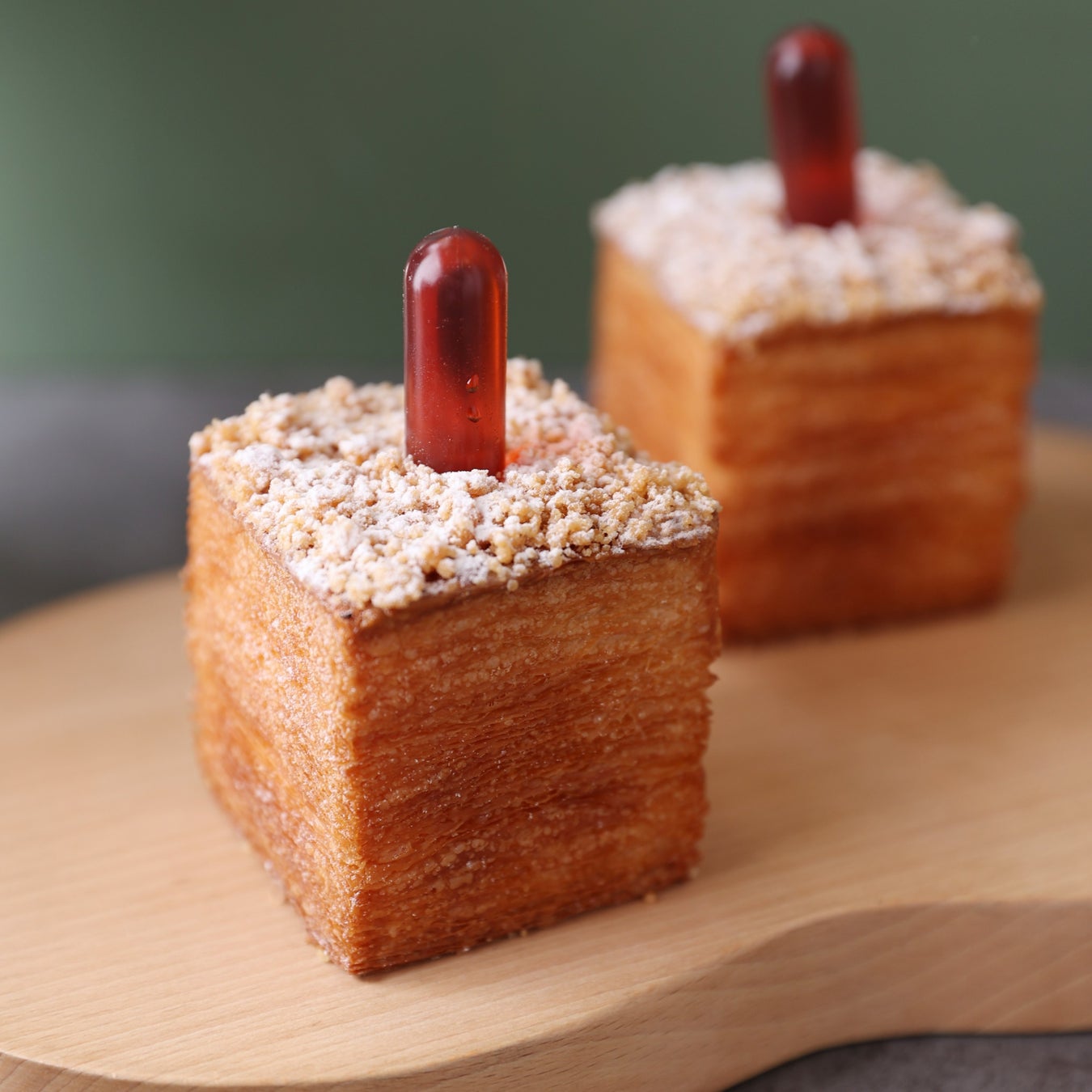 サクッとした食感のクロワッサン生地をキューブ状に焼き上げ、中のクリームは芳醇な香りのタヒチ産バニラを使ったカスタードクリームに生クリームをあわせ、軽やかで上品な甘さに仕上げました。上にかけたクランブルが見た目にも食感にもアクセントとなっています。スポイトに入ったカラメルをかけると、ほろ苦い味わいも加わり、さらに美味しく食べられます。