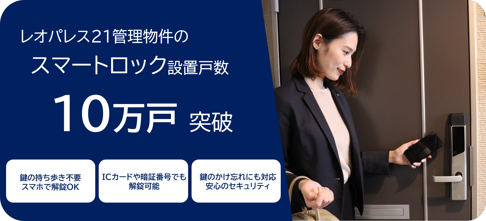 株式会社レオパレス21(東京都中野区 代表取締役社長:宮尾 文也、以下「当社」)は、管理物件への「スマートロック」の設置戸数が業界最大水準である10万戸を突破したことをお知らせいたします。