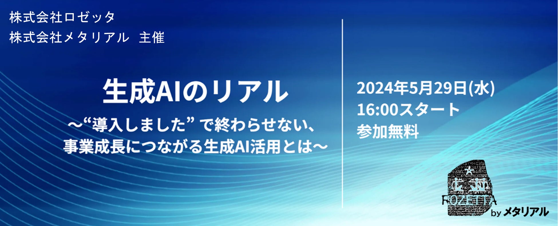 AI翻訳のロゼッタ、自社初となる生成AIイベント「生成AIのリアル 〜“導入しました”で終わらせない、事業成長につながる生成AI活用とは〜」2024年5月29日(水)に開催。メタリアル・グループ