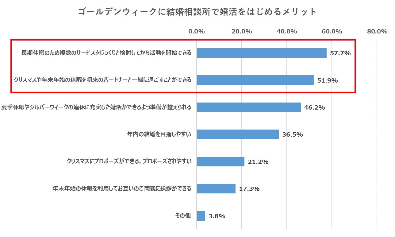「長期休暇のため複数のサービスをじっくりと検討してから活動を開始できる」が57.7%、「クリスマスや年末年始の休暇を将来のパートナーと一緒に過ごすことができる」が51.9%とそれぞれ半数を超えました。準備にしっかりと時間をかけることができる点、クリスマスなど年末年始のイベントにパートナーと過ごせる点は大きなメリットのようです。