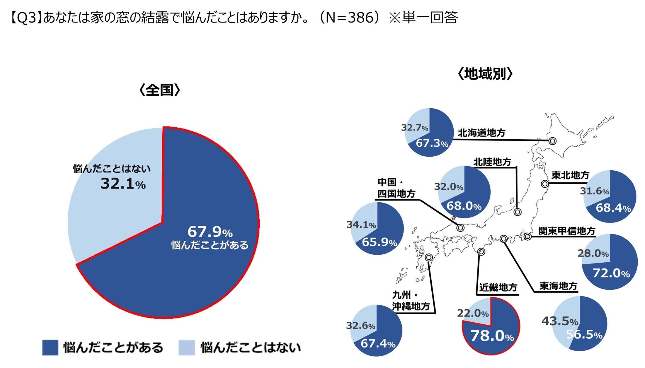 調査結果①:窓の結露を経験したことのある人は77%であり、そのうち窓の結露に悩んでいる人は68%も存在することが明らかに。また、特に近畿地域でお悩みが多いという結果に。