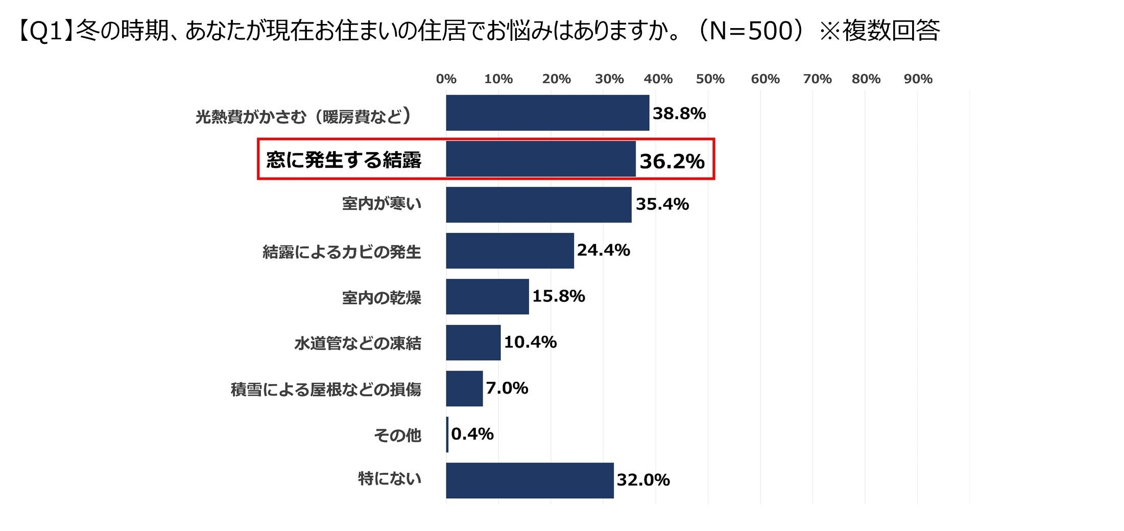 「冬の時期の、現在のお住まいの住居でお悩み」の第1位は「光熱費がかさむ(暖房費など)」(39%)。第2位は「窓に発生する結露」(36%)、第3位は「室内が寒い」(35%)であり、52%の人は室温の調整や費用に悩んでいることが明らかになりました。