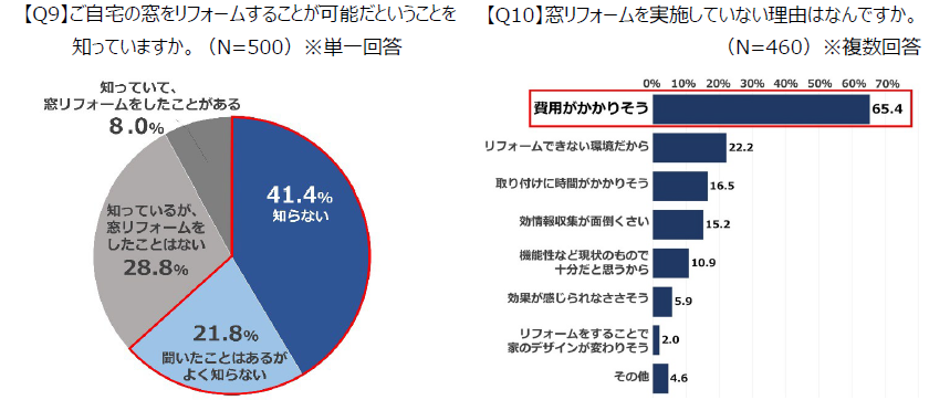 「自宅の窓はリフォーム可能だと知っているか」を聞くと、「知らない」「聞いたことはあるがよく知らない」という回答が63%を占め、そもそも自宅の窓がリフォームできることを知らない人が多数いることが明らかになりました。