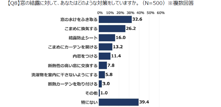 また「窓の結露対策」についても「対策をしていない」人が75%という結果に。対策をしている人はわずか25%と、結露の悩みに対処できている人は少ないことが浮き彫りとなりました。続いて「窓の結露の対策術」を聞くと、「窓の水気をふき取る」(33%) 「こまめに換気する」(26%)といった手軽なアクションが上位にあがりました。窓の断熱性を高め結露を生じにくくする「内窓をつける」「断熱性の高い窓に交換する」といった、窓自体に工夫をしている人は少数にとどまりました。