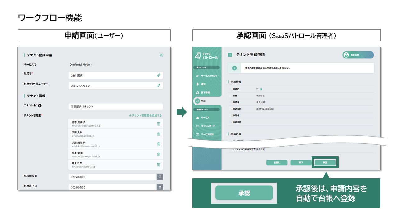 ワークフロー機能は、新しいテナント(契約)やサービスを利用するユーザーの申請・承認を行うことができます。申請されたテナントやユーザーは、承認後自動で台帳に登録されます。SaaSパトロールの管理者は、台帳への自動反映により手動転記の手間を省くことができ、データの整合性を保つことができます。