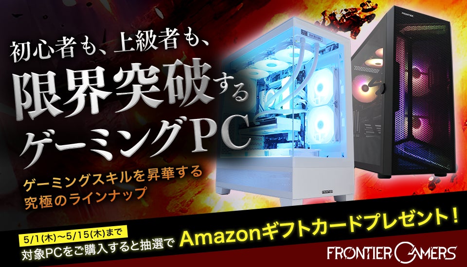 このたびFRONTIERダイレクトストアでは、ゲーミングブランド「FRONTIER GAMERS」に掲載の対象デスクトップPCをご購入いただいたお客様を対象に、抽選でAmazonギフトカードが当たるキャンペーンを実施いたします。