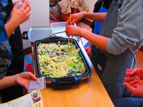 ホットプレートを使って野菜とうどんを炒め、子どもたちだけで「鶏ちゃん焼きうどん」を完成できました!