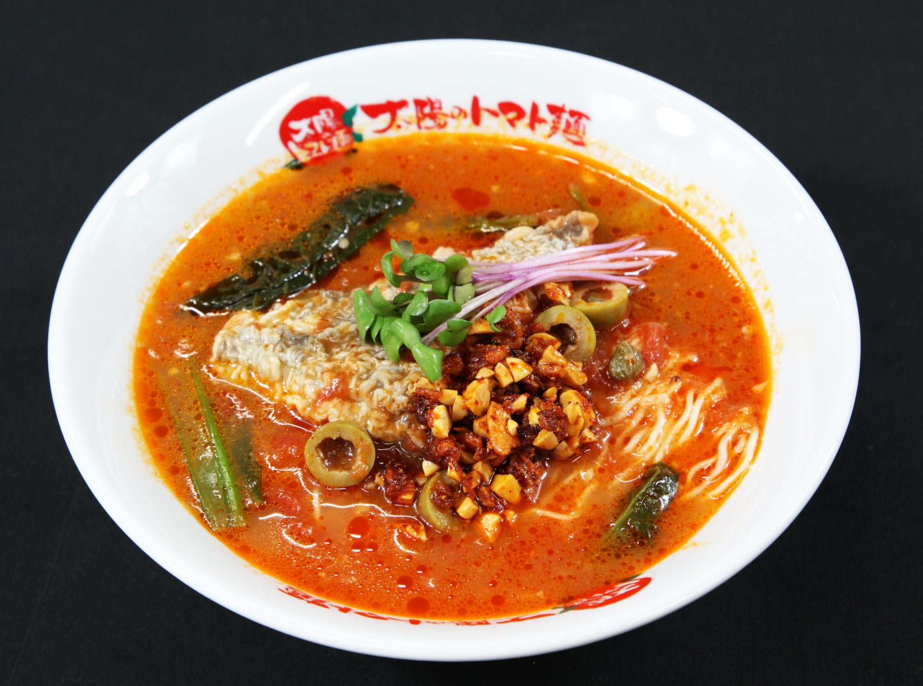 「太陽のトマト麺」オンラインショップでは、月替わりで、ユニークなトマトラーメンもご紹介しております。5月の限定トマトラーメンは、「アクアパッツァトマト麺」。香ばしく焼き上げた白身魚を、その香りと共にトマトスープに閉じ込めました。スープには「食べるオリーブオイル」が別添されております。上質なオリーブオイルに辛味と香味を加えた、この「食べるオリーブオイル」をラーメンにかけると、柔らかな白身魚とトマトスープがより一層味わい深く、上質な一杯をお楽しみいただけます。