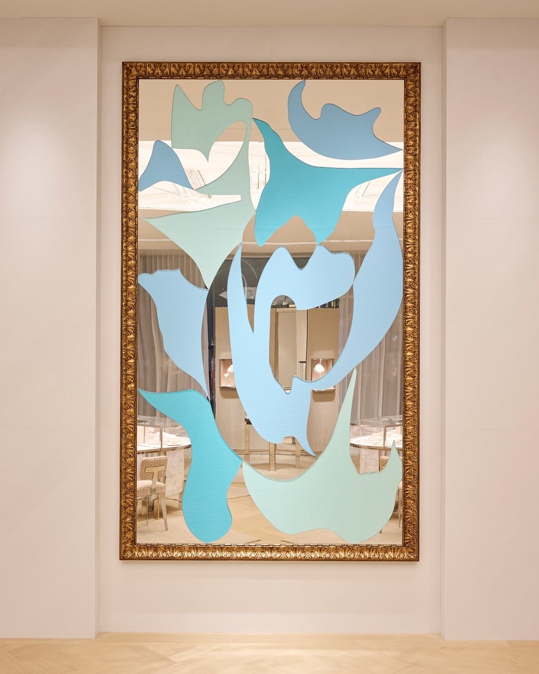 伝説的な建築家、ピーター・マリノがデザインした店内は、訪れる人をたちまちティファニーの世界へと誘います。ティファニーと日本との豊かなつながりを称え、日本の文化や工芸に敬意を随所に見られます。店内には、ススム・カミジョウ氏をはじめとする日本人アーティストをはじめ、ジュリアン・シュナーベル、ダミアン・ハースト、ミケランジェロ・ピストレット、ヴィック・ムニーズ、リチャード・プリンス、ドナルド・ジャッドなど、世界的なアーティストの作品を含む50点以上のアート作品が展示されています。また、ティファニーの約200年の歴史と日本との強い結びつきを記念して、ティファニーのアーカイブ ピースから約65点の名作が展示され、その半数は日本初公開です。