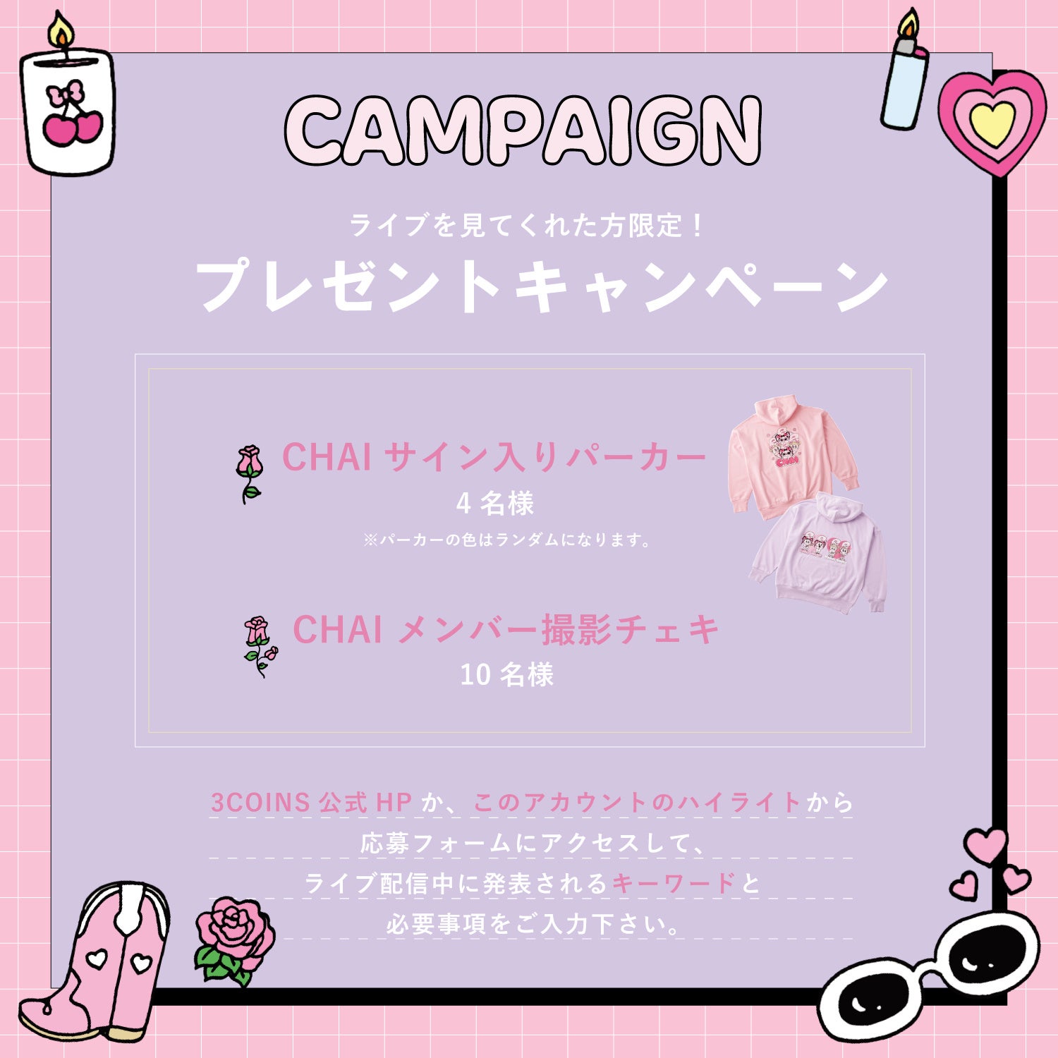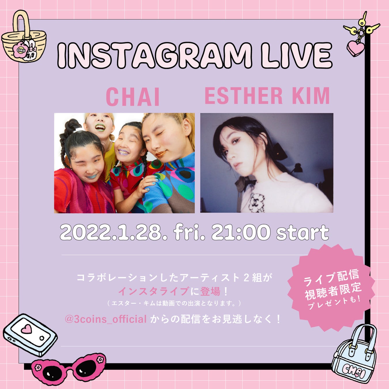 3COINSのInstagram公式アカウントにて、CHAIのメンバーが出演する特別配信を行います。配信内ではプレゼント企画やイラストレーター・Esther Kimさんのコメント映像公開も予定しています。