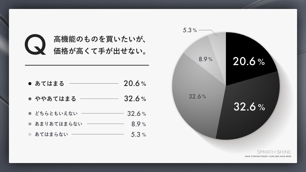 昨今、ヘアアイロンは2000円台から数万円する高価格なものまで幅広い価格帯で展開され、22年(1月-12月) 家電量販店市場におけるヘアアイロンの平均価格は20年比で116%*3と伸長しています。高単価へのシフトが加速したことで、高価格帯(1万円以上)の金額構成比が29%(22年1月-12月)*4を占め、今後も高価格帯市場の拡大が見込まれます。しかし、自社で行った調査によると過半数の方が高機能のヘアアイロンを使用したいが、価格が高いために購入をあきらめていることが分かりました。*5