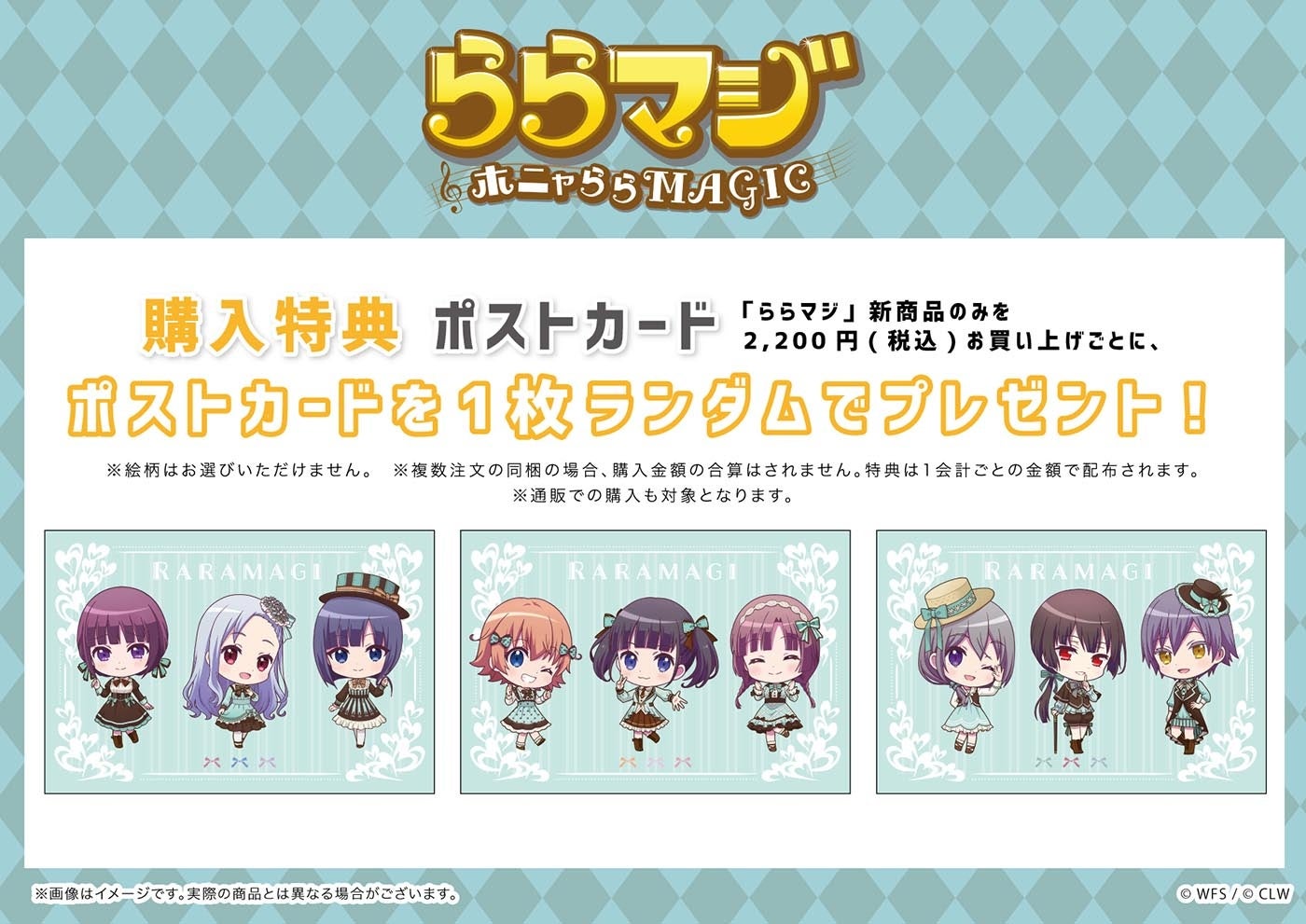 『ららマジ』新商品のみを1会計2,200円(税込)お買い上げごとに、購入特典としてポストカード(全3種)をランダムで1枚プレゼント。新作グッズと同様にここでしか手に入らない限定品なので、ぜひGETしてください!