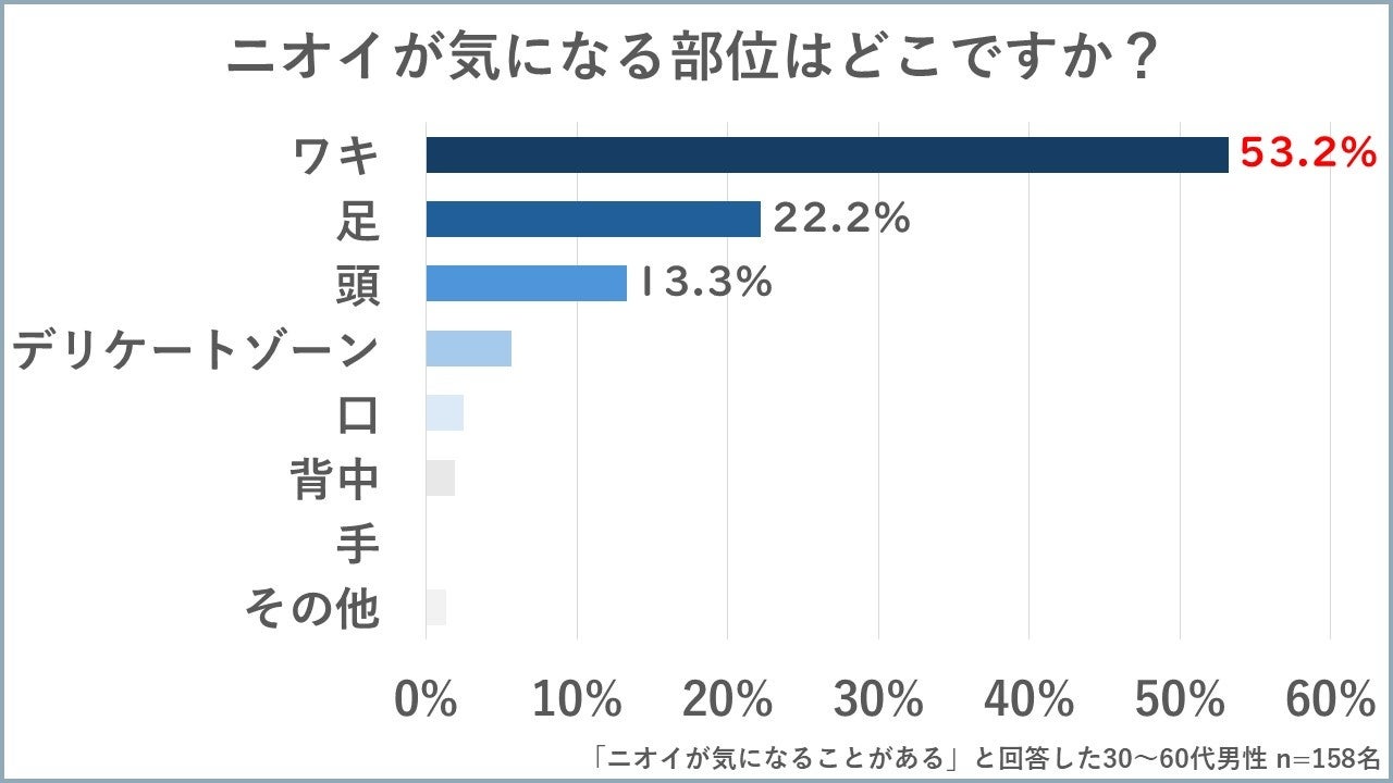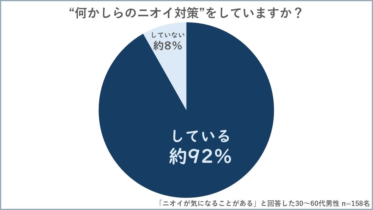 「ニオイが気になることがある」と回答した30~60代男性158名の「ニオイが気になる部位」は「ワキ」が最多となり、続いて「足」、「頭」という回答が続きました。一方で、実に約9割が既に対策に取り組んでいるという結果に。現代男性にとってニオイ対策はもはや“身だしなみの一部”として浸透していることがうかがえます。