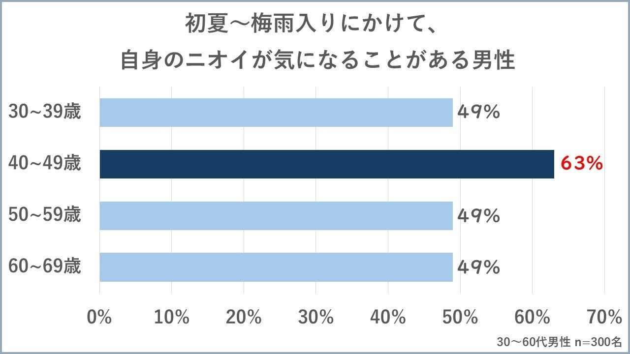 気温とともに高まる“ニオイへの不安”―― 30~60代男性300名に実施した調査によると、約2人に1人が「初夏から梅雨にかけてニオイが気になる」と回答。さらに、年齢別に見てみると40~49歳の男性が約63%と最も「ニオイが気になる」ということが分かりました。また、「何℃くらいからニオイが気になり始めるか?」という質問には、平均24.6℃というリアルな“ニオイのボーダーライン”が判明しました。気温が上がるとともに、ニオイへの意識が急上昇していることが明らかになりました。