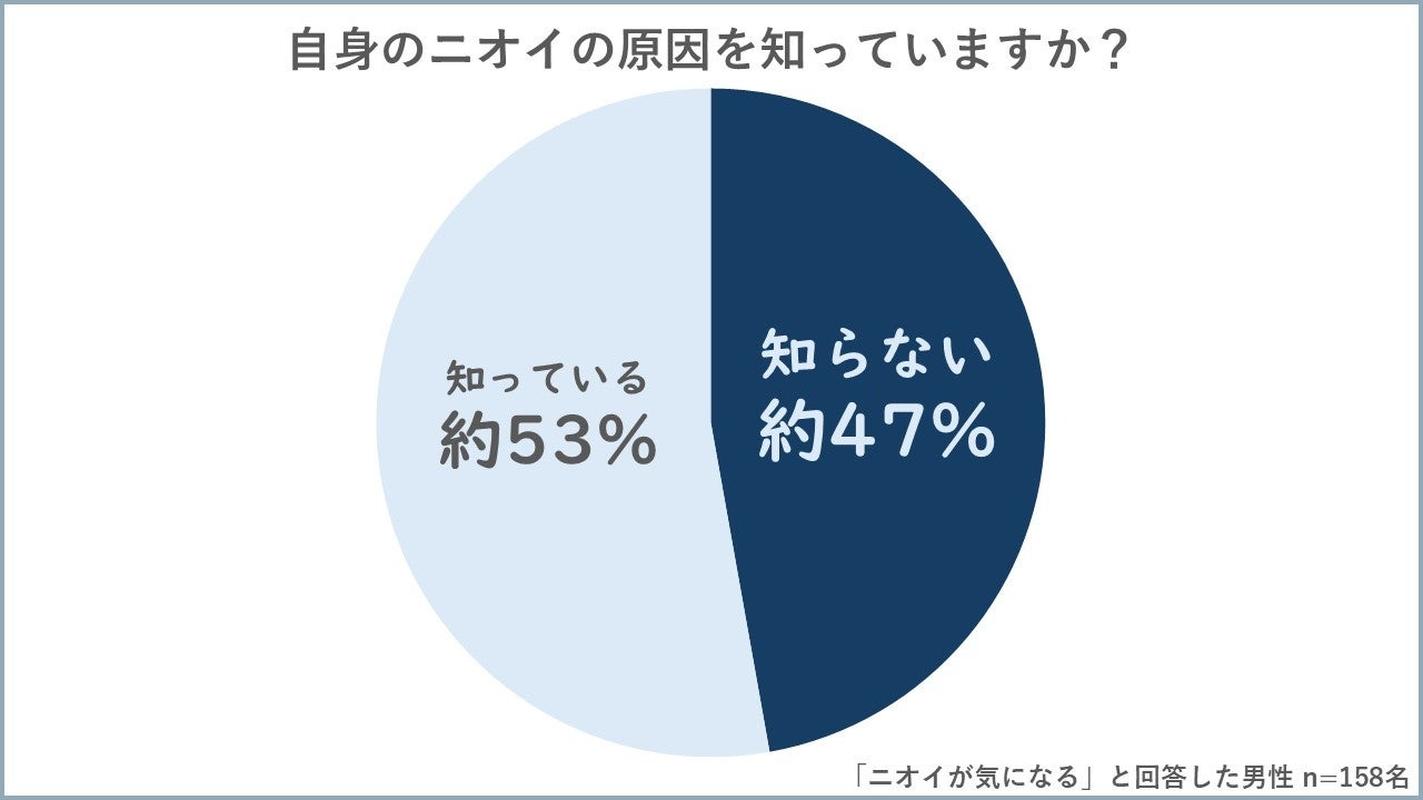 ニオイが気になると回答した男性158名のうち、自身のニオイの原因を知らないのは約半数と、ニオイの原因に関する知識が乏しい実態が判明しました。さらに、皮膚から自然に放出される揮発性ガス=“皮膚ガス”という近頃話題のニオイの要因について知っている人はわずか約14%。情報のアップデートが追いついていないことが明らかになりました。