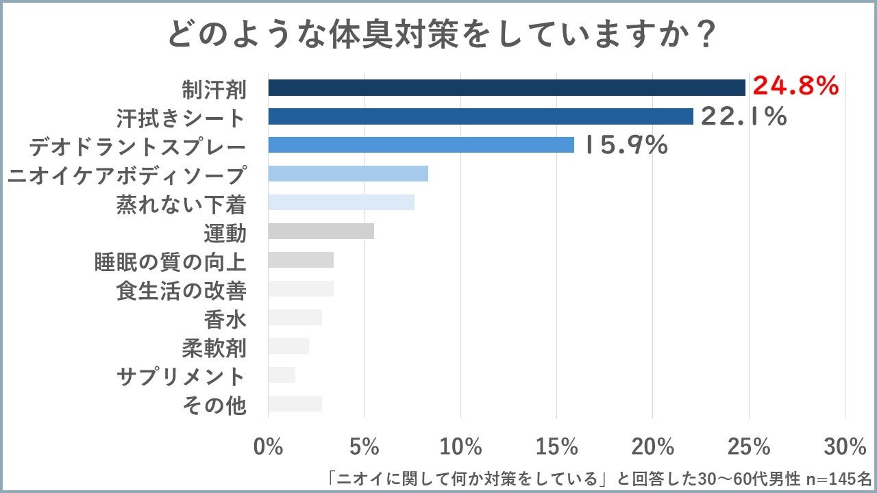 具体的な対策としては、「制汗剤(24.8%)」「汗拭きシート(22.1%)」が上位を占め、やはりニオイ対策グッズが主流。中でもボディソープで“ニオイを根本的に洗い流す”のではなく、“ニオイを抑える”グッズが人気なようです。しかしニオイ対策を行っている男性が多い一方で、「運動(5.5%)」「睡眠の質の改善(3.4%)」「食生活の改善(3.4%)」など、表面的なニオイ対策ではなく抜本的に体の内側からの改善を図る“生活習慣派”はまだまだ少ないことが分かりました。