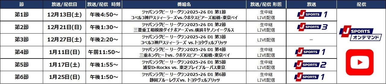 さらに、12月、1月は各節の注目試合を無料で放送・配信※4します。 なおYouTubeのJ SPORTS公式ラグビーチャンネルでも同様に無料でLIVE配信しますのでお楽しみください。