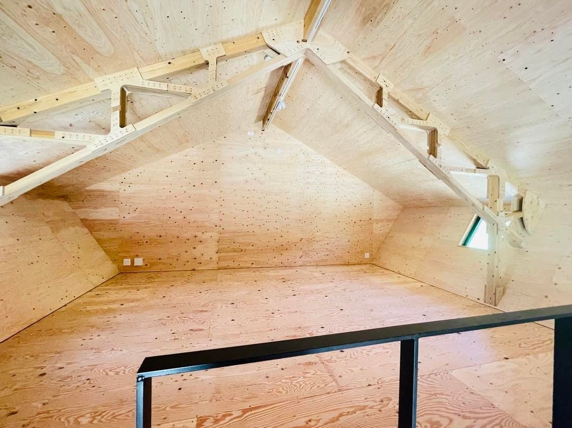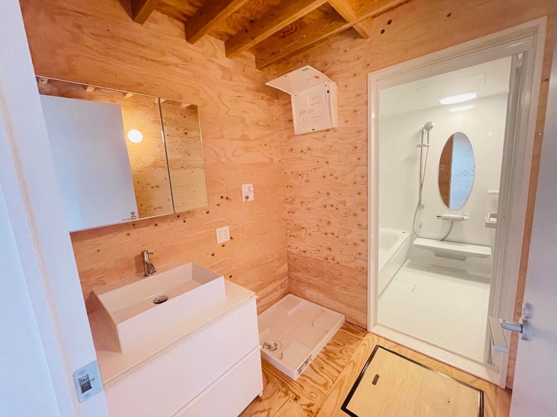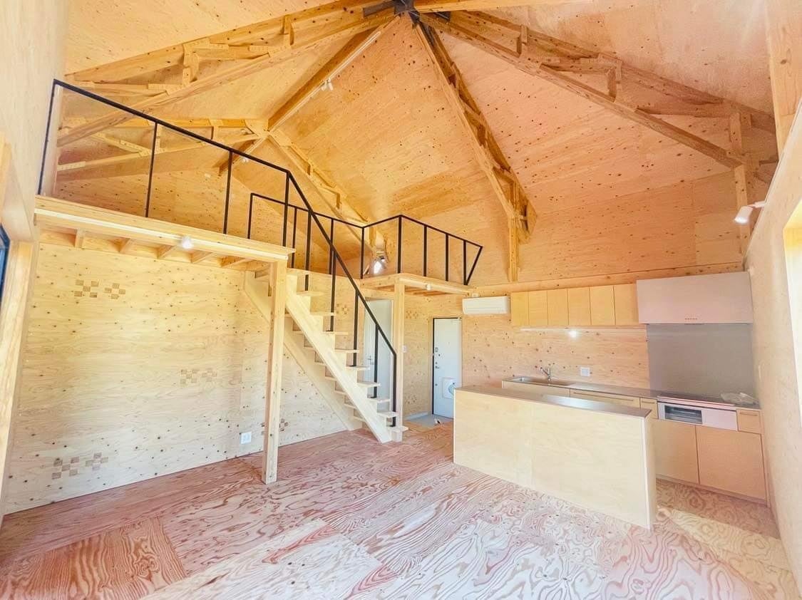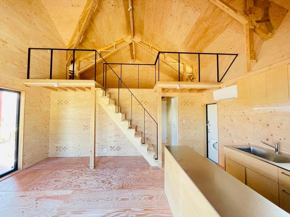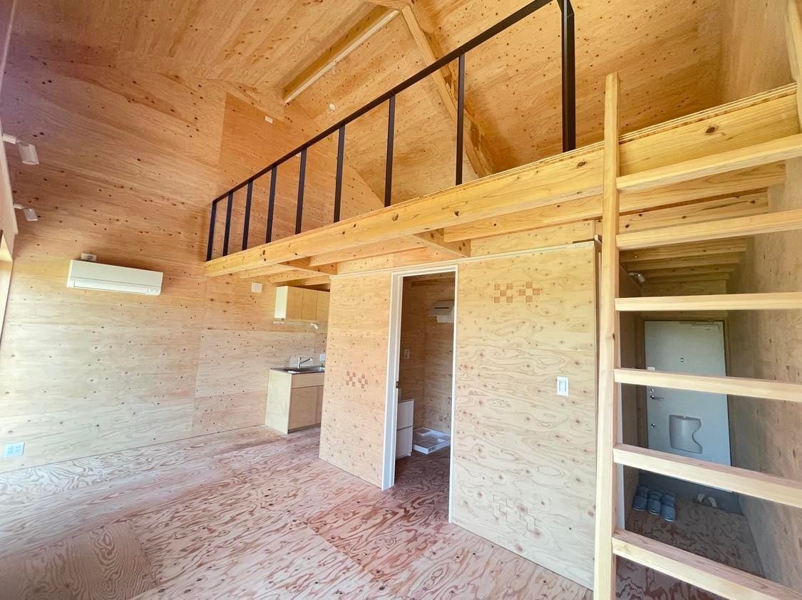 約50平米の空間に吹き抜けの天井と2階建ての作りになっています。2階は約20平米の寝室スペースを設けており、2〜3人で住むにはピッタリの広さです。短期滞在であれば4人でも居住可能です。