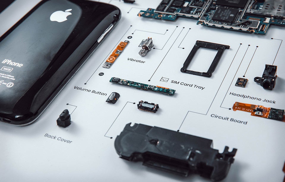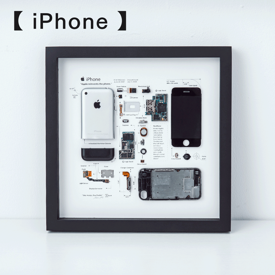 職人により慎重に解体され、手作業で一つ一つ丁寧に作られています。身近なiPhoneの見たことのない内部パーツが整然と並んだアートフレームは、まるで解剖図のようです。