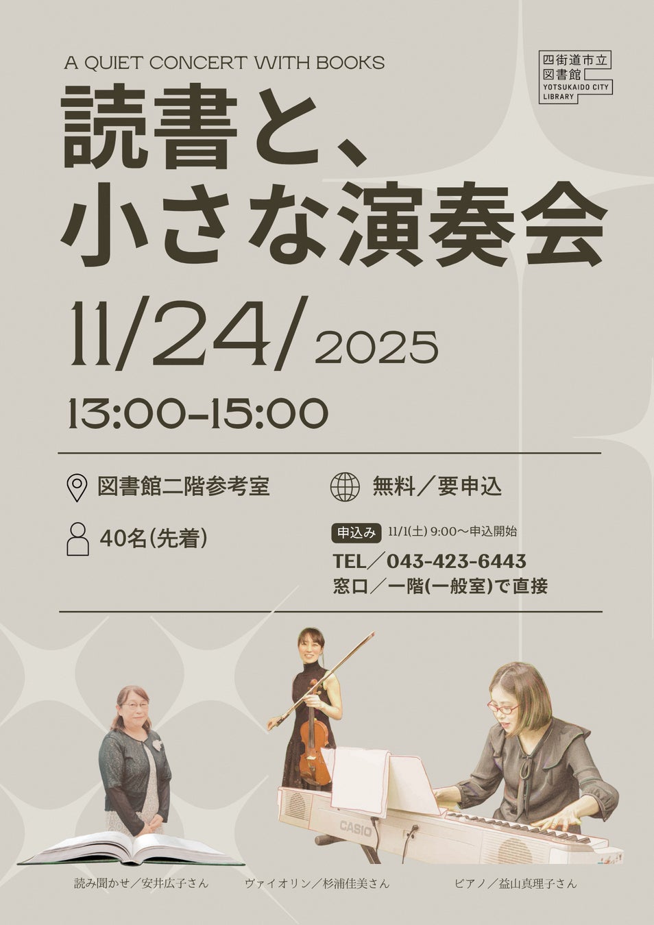 11月24日(月・休)に四街道市立図書館で「読書と、小さな演奏会」を開催します。読む人の時間に、音楽がそっと寄り添う特別なひとときを過ごしませんか。