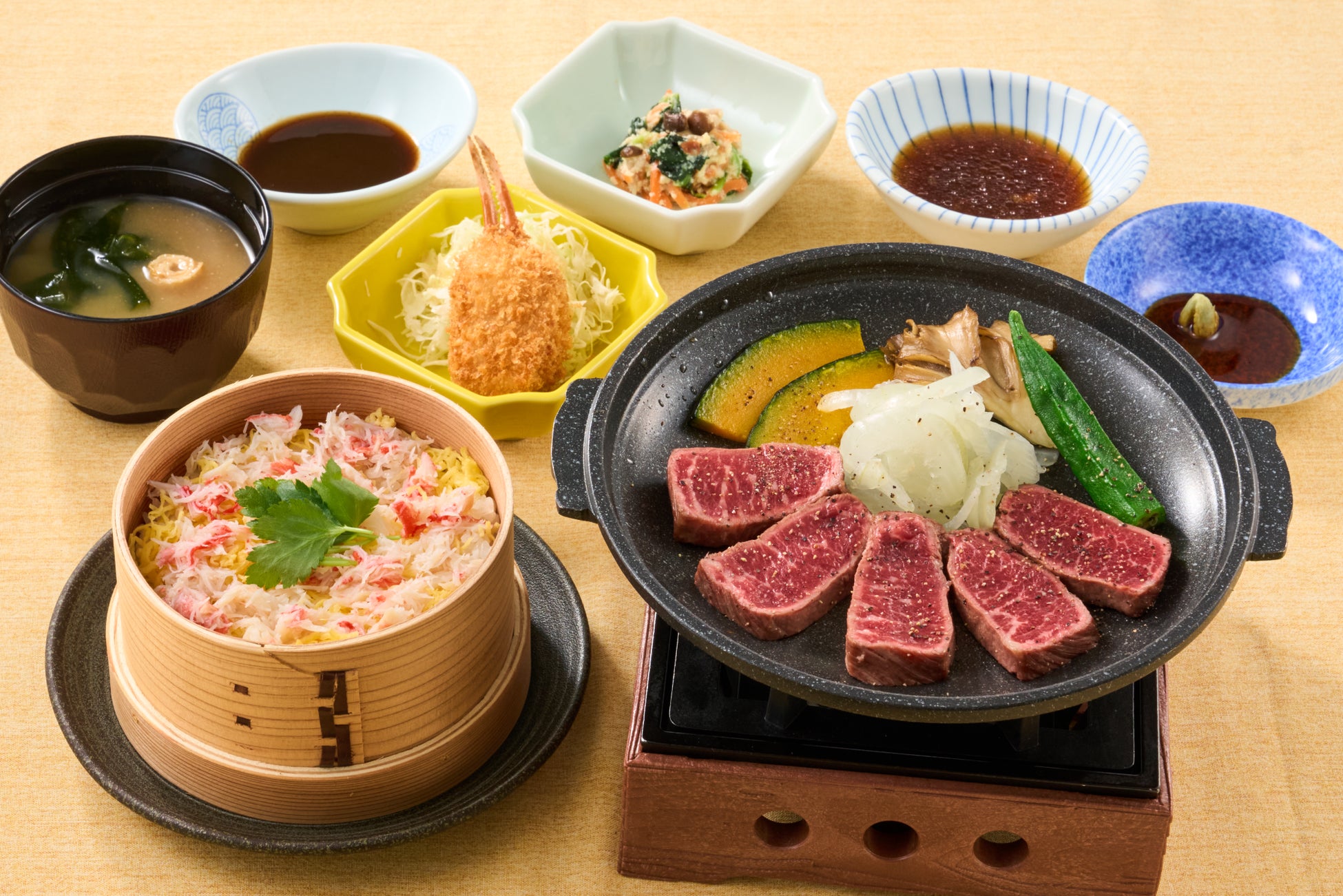 牛みすじの陶板ステーキ・本ずわい蟹のせいろ御飯・紅ずわい蟹爪フライ・小鉢