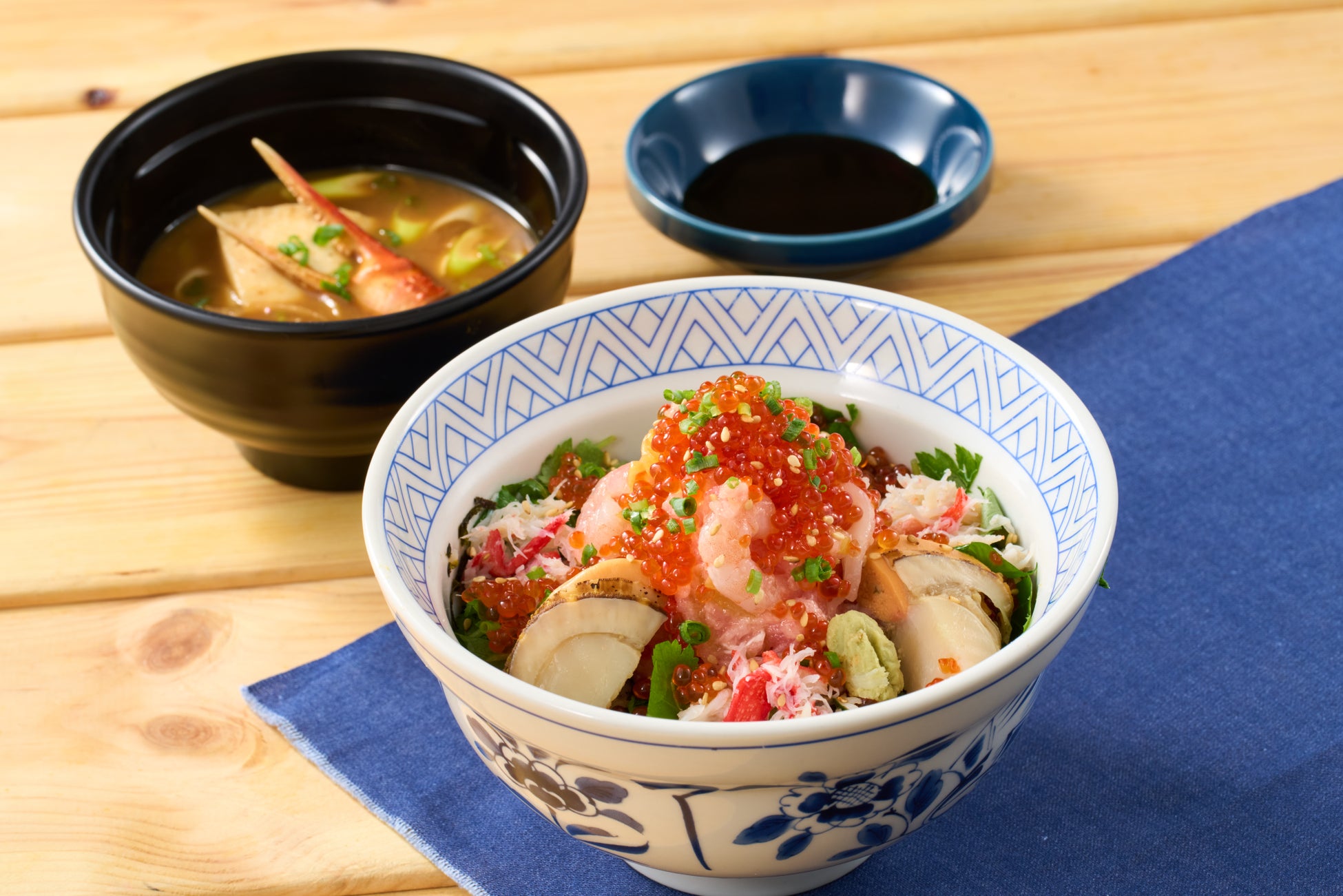 海鮮丼は本ずわい蟹、北海道産帆立をはじめ、7種の具材を豪快に盛り付けた年末年始仕様。八丁味噌(※)の蟹汁も選べて海鮮づくしのセットです。