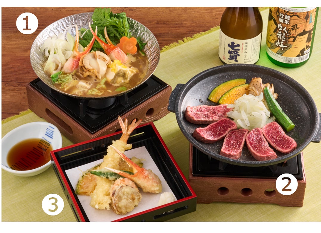 蒸したての「本ずわい蟹のせいろ御飯」や、卓上で焼く「牛みすじの陶板ステーキ」などが、お値打ち価格で楽しめます。