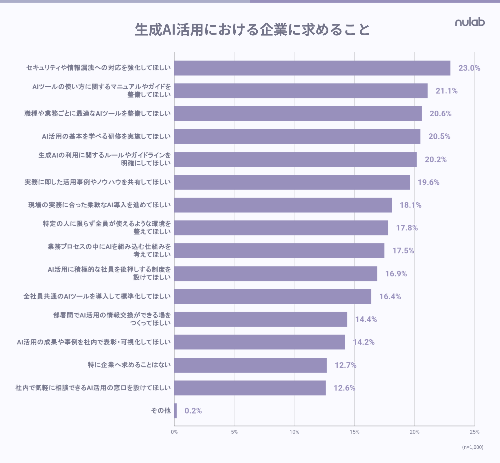 生成AI導入において企業に求める取り組みとして、「実務に即した活用事例やノウハウの共有」や「成果の可視化」を求める声が多く挙がりました。チームとしての活用方法が明確でないことが、導入後の活用定着を阻む要因となっていると考えられます。