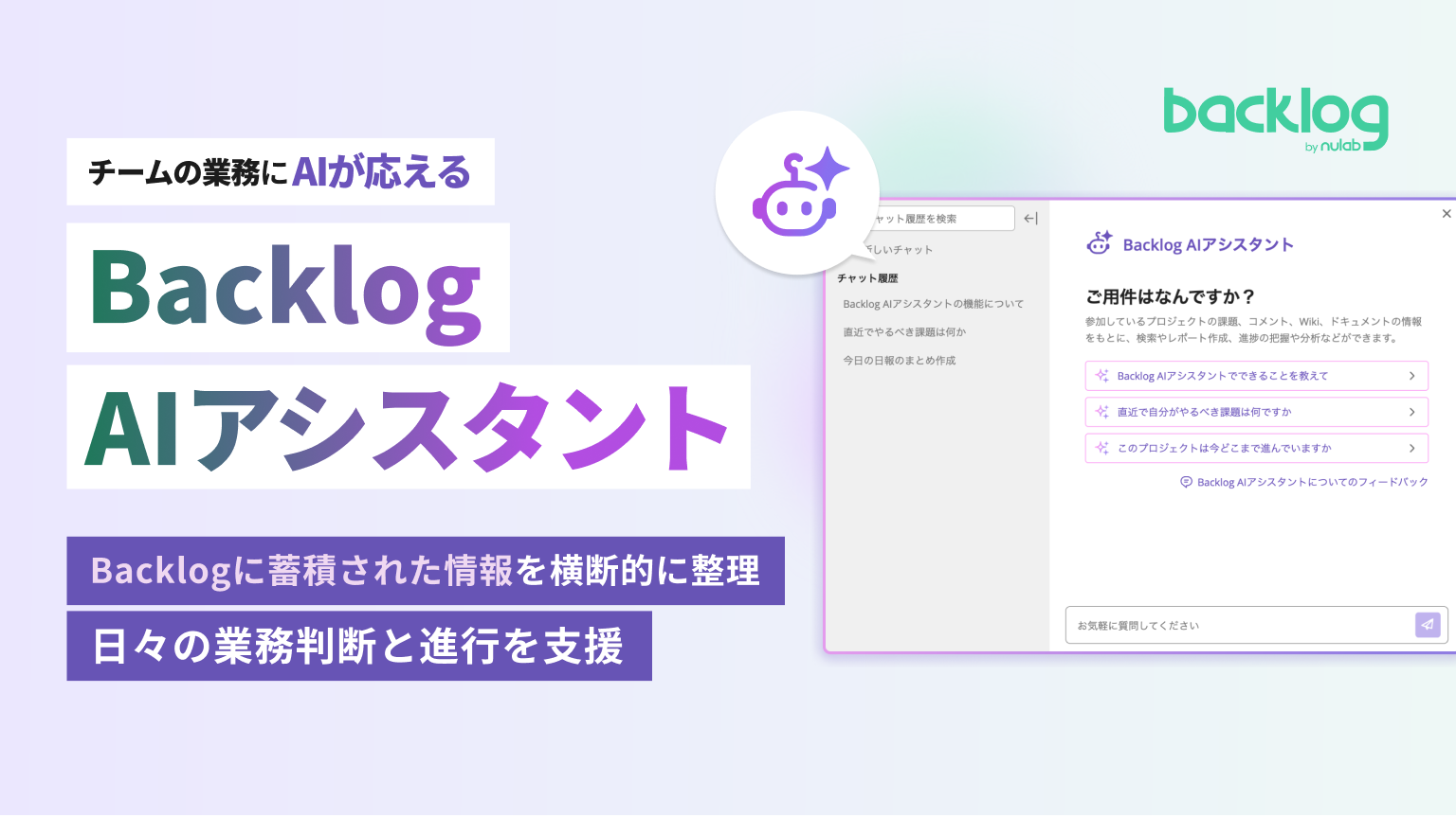 なお、ヌーラボでは、こうした課題を背景に、プロジェクト・タスク管理ツール「Backlog」において、業務データをもとにチームの進行を支援するAI機能「Backlog AIアシスタント」を2026年3月5日より提供開始しています。
