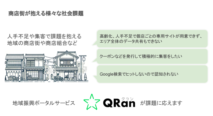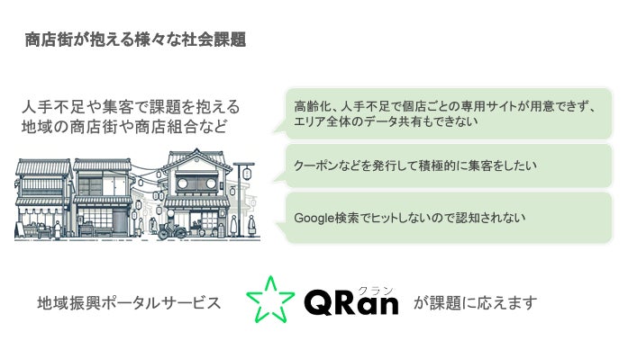 来年1月末頃まで、同社が開発したウェブアプリ「QRan(クラン)」を用いて、商店街の店舗やイベントなどの情報を発信することで、集客力の向上効果を検証していきます。