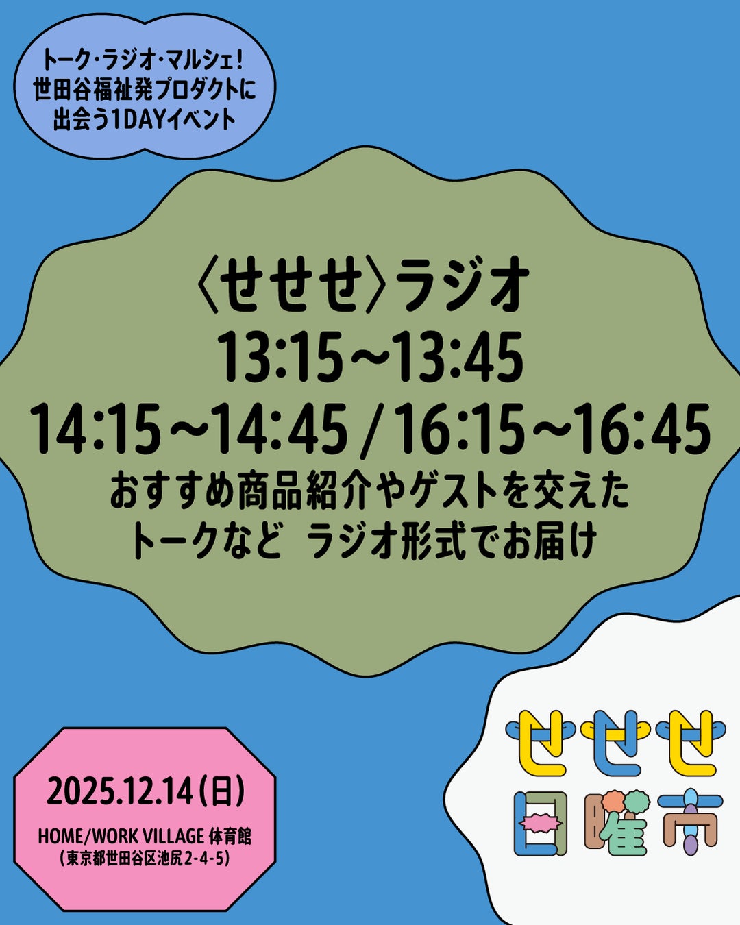 株式会社マガジンハウス(以下マガジンハウス、本社:東京都中央区、代表取締役社長:鉄尾周一)は、2025年12月14日に開催される「せせせ日曜市〜トーク・ラジオ・マルシェ!世田谷福祉発プロダクトに出会う1DAYイベント〜」(以下、「せせせ日曜市」)の企画・運営を担当しています。