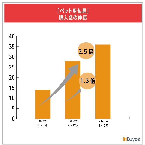 「ペット関連アイテム」全体での購入数はほぼ横ばいで推移していますが、ペットブームの続く台湾で、ペット用仏具が2022年1月~6月比で約2.5倍に、2022年7月~12月比では1.3倍と継続的に伸長しています。生活習慣に根差した「独自性」のある商品が、海外の新しい習慣と合致し、購入が増加していると考えられます。