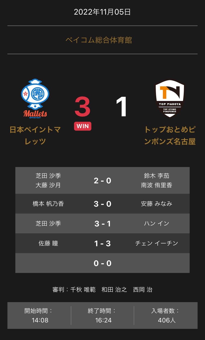 ノジマTリーグ 2022-2023シーズン 公式戦 11月05日開催 日本ペイントマレッツ vs トップおとめピンポンズ名古屋 試合結果