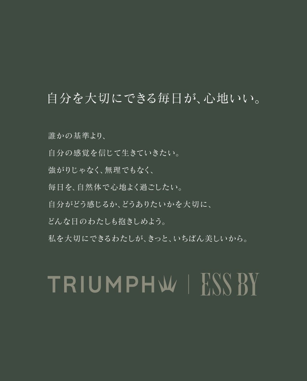 TRIUMPH|ESS BYは、本コレクションテーマを「自分を大切にできる毎日が、心地いい。」という思想へ翻訳しました。肌に直接つけるランジェリーだからこそ、長時間身に着けるものだからこそ、誰かのためではなく、自分のために身に着けてほしいと考えました。