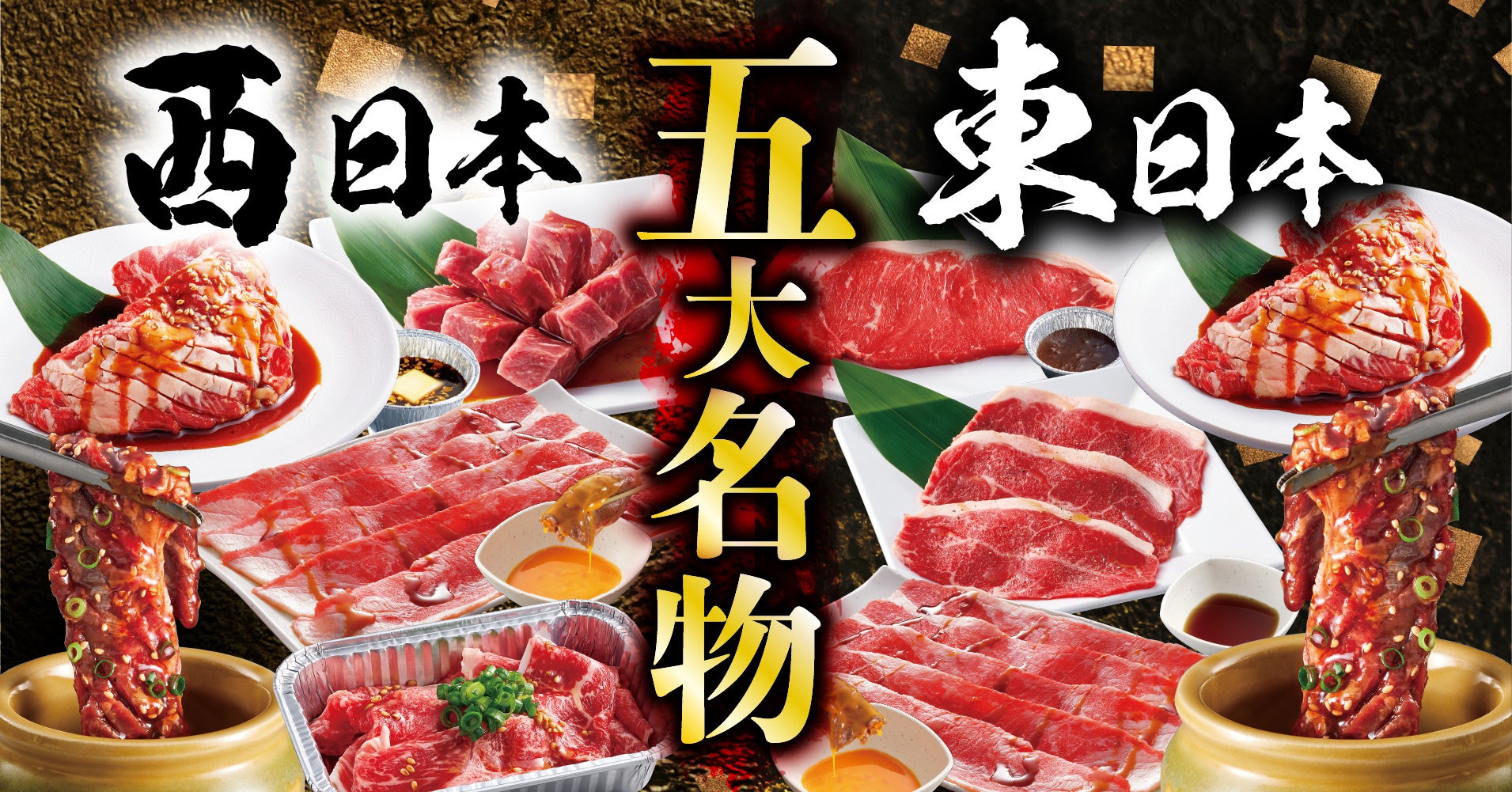 『焼肉きんぐ』の看板メニュー四大名物が、五大名物に進化して登場いたします。東西で違うメニューを