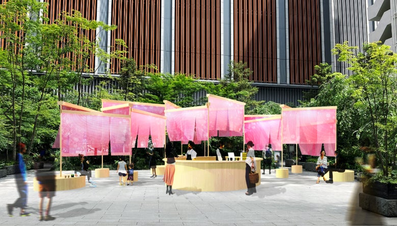 また昨年、好評いただいた桜のれんに使用される大小7パターン・総枚数16枚の大判のれんは、ソメイヨシノやおかめ桜、河津桜など、日本橋で花を咲かせる多様な品種の桜にちなんだ日本橋らしい桜色と、風に舞う花びらをイメージした柄をデザインしています。福徳の森に設置された今年は、都会の中心ながらも木々に囲まれた落ち着いた空間の中で、昨年とは違う幻想的な雰囲気をお楽しみいただけます。
