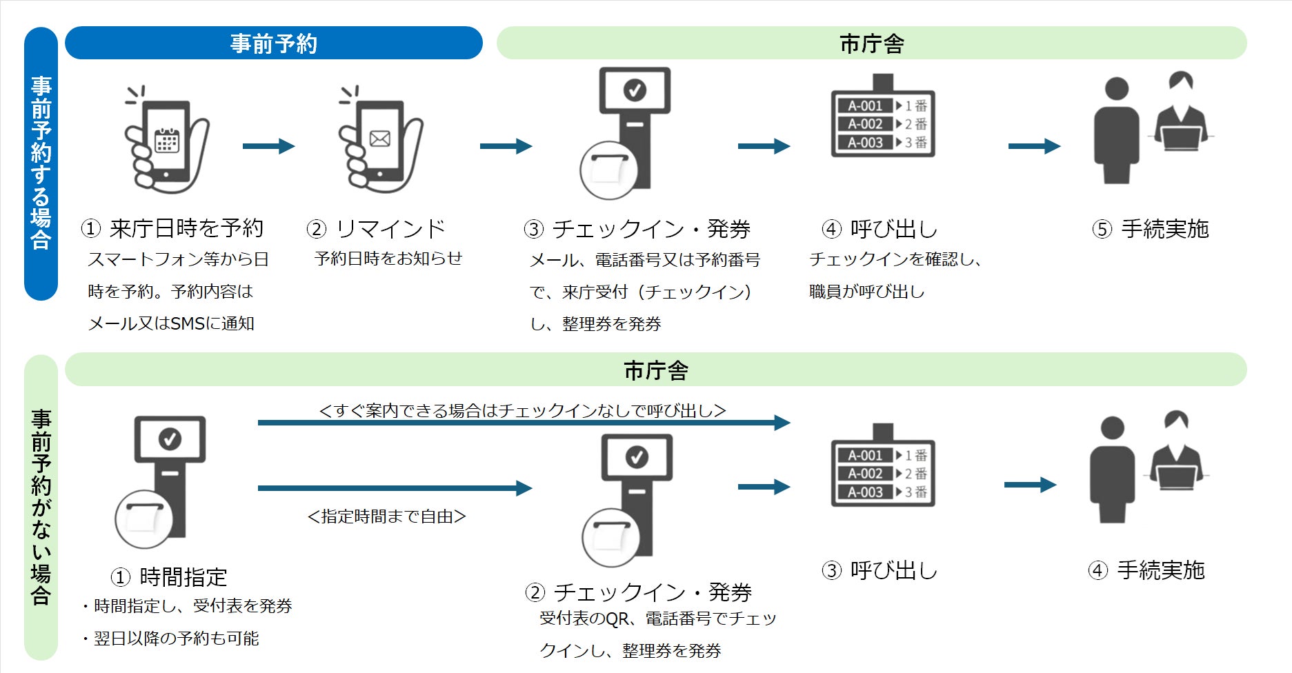 市民課と各市民センター(※)では、来庁者の待ち時間を削減するため、オンライン予約機能付き発券機を導入します。窓口を利用する際、事前にパソコンやスマートフォンで来庁時間を予約することで、当日は待たずに手続ができるようになります。また、事前の予約がない場合でも、庁舎内に設置している端末から予約し、手続きすることができます。