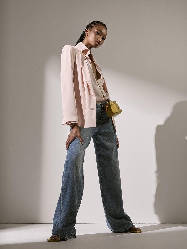 デザインの特徴は、シンプルなライン、ニュートラルなカラートーン、大胆なディテールのバランスにあり、「洋服はストーリーを語り、自己表現の手段である」という理念に基づいています。2025年春夏コレクションでは、デニムを代表とする定番アイテムに加え、ベージュ、サンド、ライトグリーン、ペールピンク、レッドといった多彩なカラーパレットを採用し、アルマーニのシグネチャーカラーであるブルーやベーシックなブラックと組み合わせています。
