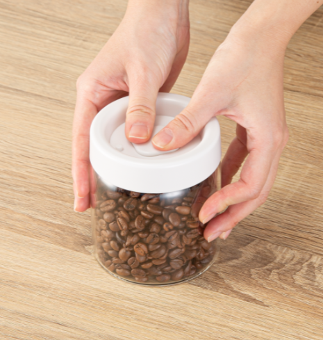 このガラスキャニスターは、フタにあるボタンを押すだけで、簡単に真空状態にできます。本体が透明なガラス製なので、中も見えて、ニオイ移りや色移りもしにくくなっています。