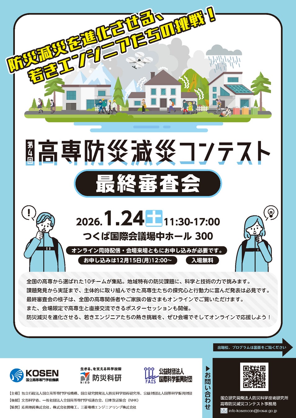 独立行政法人国立高等専門学校機構(東京都八王子市、理事長:谷口功)は、国立研究開発法人防災科学技術研究所(茨城県つくば市 理事長:寶馨)及び公益財団法人国際科学振興財団(茨城県つくば市 会長:住川雅晴)との共催で、令和8年1月24日(土)につくば国際会議場 中ホール300(茨城県つくば市竹園2-20-3)で「第4回高専防災減災コンテスト 最終審査会」を開催します。