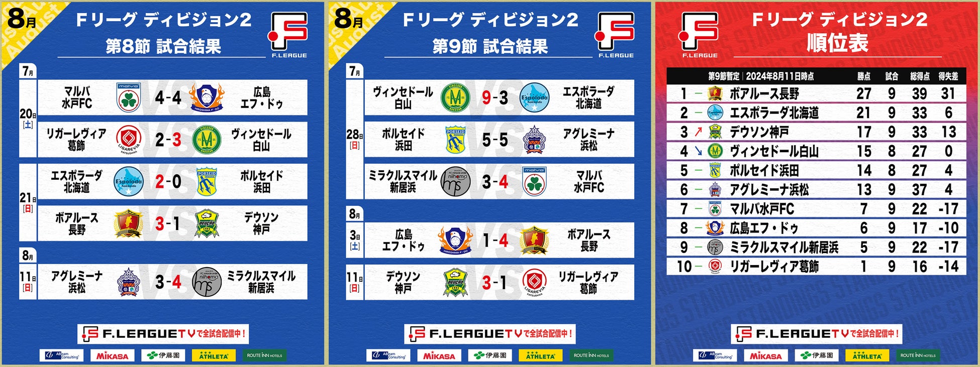ミラクルスマイル新居浜が今季初勝利!ボアルース長野は開幕9戦全勝、堂々首位で中断期間へ!第8・9節 試合結果※8月11日時点【Fリーグ2024-2025 ディビジョン2】今こそ最高のフットサルを