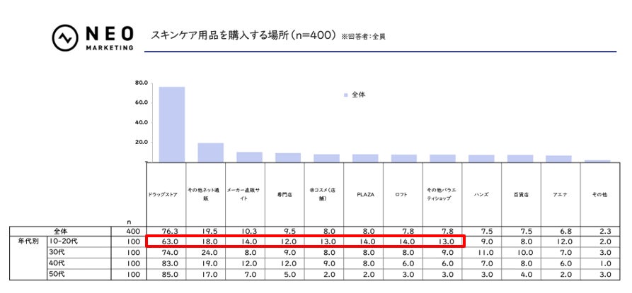 一方で10–20代は63.0%とやや低く、「@コスメ(店舗)」や「ロフト」など複数のバラエティショップ、さらには「メーカー直販サイト」や「その他ネット通販」も10%強活用しており、チャネルの“多拠点化”が進んでいます。