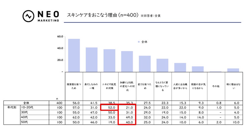一方、10–20代は「ニキビや肌荒れ対策」が52.0%と全体平均を大きく上回り、前掲設問【現在使っているスキンケアアイテム】での同世代の美容液使用率の高さと合致します。
